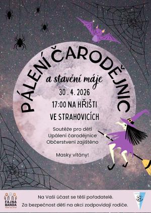 Ve čtvrtek 30. dubna 2026 se na hřišti ve Strahovicích uskuteční od v 17:00 hod. stavění máje s pálením čarodějnic