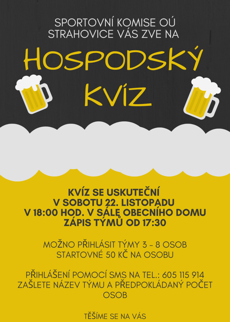 Sportovní komise OÚ zve v sobotu 22.11. od 18 hod. do sálu Obecního domu na hospodský kvíz. Srdečně zvou pořadatelé