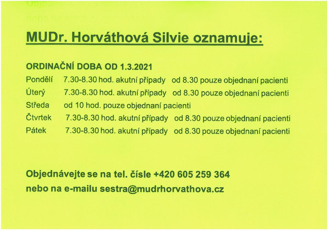 MUDr. Horváthová ordinační doba - od 1.3. - Chuchelná